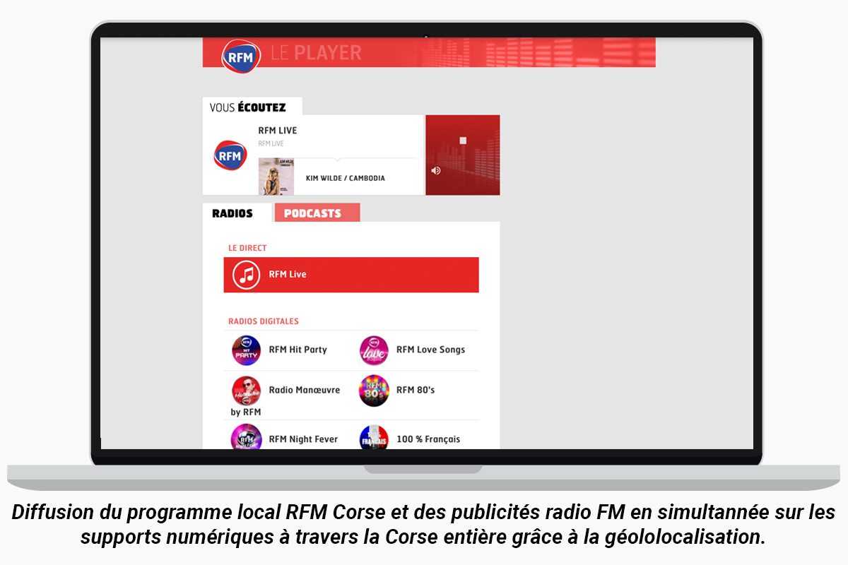 RFM CORSE est diffusée en FM et en numérique sur l'application grâce à la géolocalisation permet aux auditeurs qui viennent en Corse en vacances d'écouter les programmes d'Ajaccio sur toute la Corse.